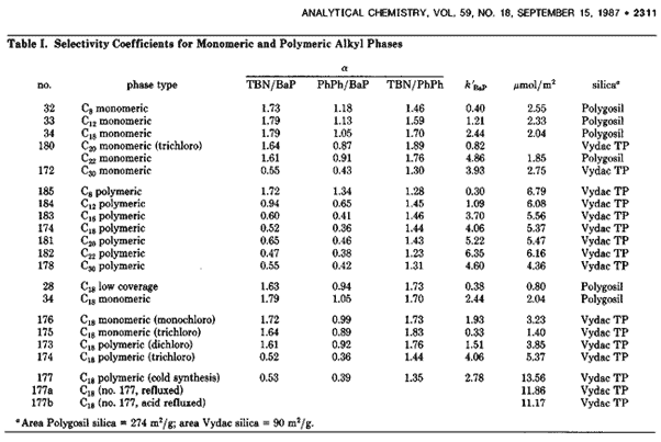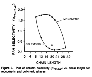 | 【C30固定相の開発経緯】 アルキル基結合型逆相固定相において,固定相のアルキル鎖長と保持は比例関係ではないということがBerendesen and de Galan (2), Lochmuller and Wilder (3),Tchapla et al. (4) らにより,20年以上も前に報告されている。炭素数20までのアルキル基結合型逆相固定相では炭素数の増加にともない保持は増加するが,炭素数20以上になると保持の増加はほとんどなく,ほぼ一定になると理解されていた。1994年に,ポリメリック結合でリガンドの結合密度を上げ,エンドキャッピング処理をせず,あえてシラノール基を残したC30固定相が,カロチノイド異性体の分離に優れているとの報告がなされた (5)。その後,この報告に基づくC30固定相が米国から市販され,逆相固定相の一員に加えられた。このC30固定相はカロチノイド異性体分離に特化した固定相であり,残存シラノール基処理をしていないため,塩基性化合物は極端なテーリングを示し,またポリメリック結合に基づく極度な疎水性と分厚い固定相の厚さのためにポリマーライクであり,水系の移動相条件ではシャープなピークが得られにくかった。 Wise et al. (6) は,アルキル鎖長と多環芳香属炭化水素 (PAHs) の分離選択性について詳細に報告している。Tetrabenzenenaphthalene (TBN)とBenzo(a)pyrene (BaP) の分離係数α(TBN/BaP) (立体選択性) を,ポリメリックおよびモノメリック型のC8からC30までの固定相を用いて比較 (Table 1) している。Figure 3に示すように,C18固定相はモノメリックとポリメリックの差が最も大きいが,なんとC8およびC30固定相はアルキル基の結合密度が2倍近く異なるにも関わらず,モノメリックとポリメリック型で同じ値を示した。 |