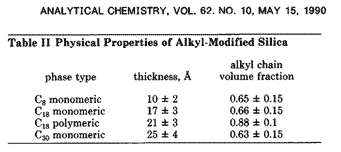 | 換言すれば,C18固定相では結合密度が少しずれても分離に大きく影響してバッチ間差が大きくなるが,C8およびC30固定相は結合密度の差によるバッチ間差が少なくなることになる。更にWiseら (8) は小角度中性子散乱法によりメタノールで分散された固定相の厚みを測定した。 | ![]() |