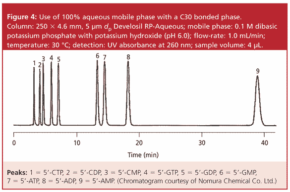 | 2) C18固定相にはないC30固定相固有の特徴的な分離 C30固定相はカロチノイド分離用に開発された経緯から分かるように,脂溶性化合物の分離に優れている。分子サイズが大きい化合物に対し,C30固定相はC18固定相と比較して分離が改善される傾向にある。カロテンのような分子サイズの大きな脂溶性化合物だけでなく,糖が付加して分子サイズが大きくなったような比較的極性の高い配糖体でもC30固定相で分離が改善される。これはアルキル基全体が溶質との相互作用に関わっており,その長さが分離や選択性に大きく影響しているものと推察される。また,メタノール溶液中においてモノメリック型C30固定相が真っ直ぐに立っておらず,絡み合い,寝込んで,その平均厚さが約6割になっているとのWiseらの報告から,メタノール/水移動相条件ではアルキル鎖長の長い固定相ほど細孔内の固定相の表面の平滑性が増し,その結果,分子サイズの大きな試料や平面性の高い試料の相互作用が増加すると考えることもできる。逆に,分子サイズの小さい化合物の多くはC30固定相とC18固定相で大差ない分離が得られている。トコフェロールはサイズの観点からもC30固定相の方が分離は良くなり,メチル基の結合部位の異なる異性体であるβ-,γ-トコフェロールはC18固定相では分離できないが,C30固定相であれば,モノメリック型でもポリメリック型でも分離可能である。 もう一つのC18固定相にないC30固定相の大きな特徴は,水リッチな移動相で保持時間の安定した分離が得られることである。従来,C8やC18等のアルキル基結合型逆相固定相は,水を95%以上含む移動相条件では保持時間の再現性が低いとされている。これはアルキル基がお互いに絡み合うことや,この絡み合いから基材表面に寝込むこと等による固定相と溶質との相互作用の減少が主な原因だと多数の研究者から報告されてきた。大学院の講義でも取り上げられる位,この事柄は常識的に語られていた。しかし,水を含む移動相条件下でも十分な分離性能が得られる様に設計されたC30固定相は,少なくとも5%以上の有機溶媒を含む移動相でC18固定相と同様に問題なく使用できると意図していたが,その範囲以上に水100%の移動相でも保持の変化がなく安定した分離が得られる固定相であった。C30固定相のアルキル基は長いため,C18固定相と比べて,絡み合いや寝込み状態は間違いなく多数存在しているはずである。にも関わらずC30固定相が安定した保持を示すという事実から,それまでの常識を疑い,充填剤細孔内から毛管作用により移動相が抜け出し,移動相と固定相の接触面積が減少することによって保持が減少することを突き止めるに至った (9-13)。Figure 4はMajors (14) によりLC/GCに紹介されたC30固定相を用いた9種のヌクレオチドのクロマトグラムである。移動相は有機溶媒を含まない緩衝液のみである。 このようにC30固定相は,モノメリック結合で,エンドキャッピングを施せば,C18固定相よりも安定した保持が得られ,使用可能な移動相範囲も拡がるため,結果としてその汎用性を高めることが可能となる。 |