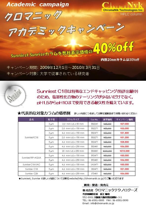 | クロマニックテクノロジーズ社製逆相カラムを大学の研究者へ40%off(内径20mm分取カラムのみ30%off)の価格で販売いたします |