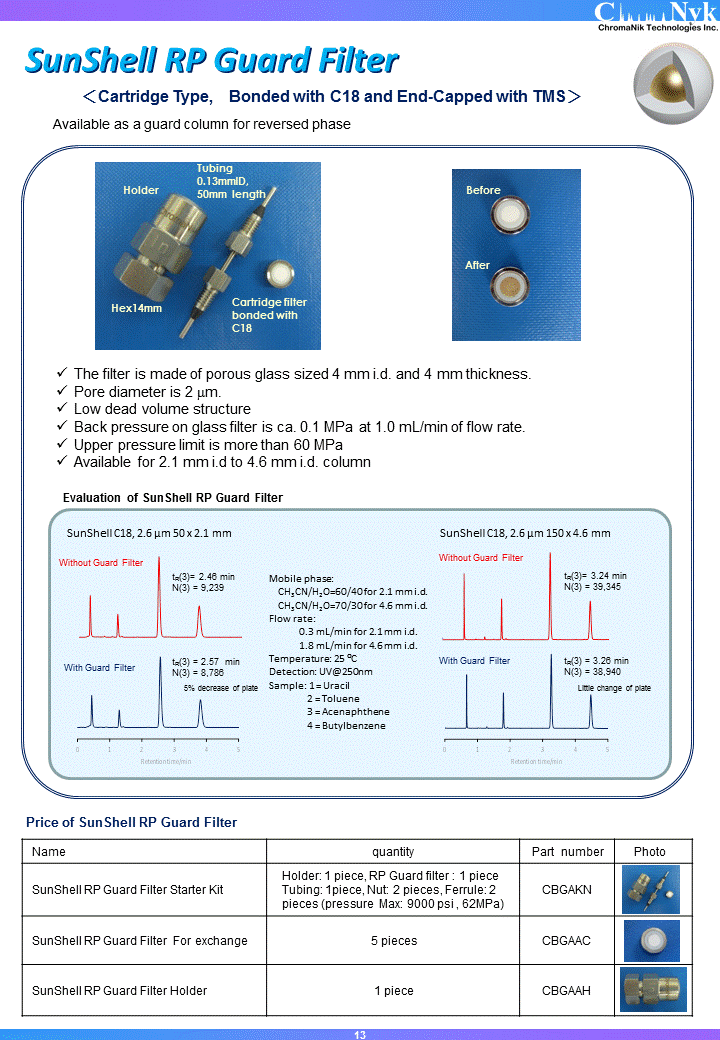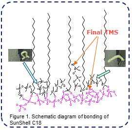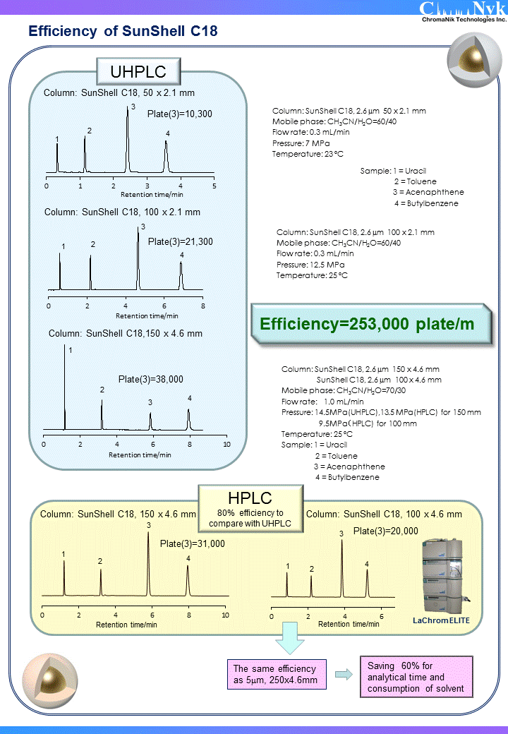 *1.6 mm of core and 0.5 mm of superficially porous silica layer *Same efficiency and high throughput as a Sub 2mm particle *Same pressure as a 3 mm particle (less than a half then a sub 2mm particle) *Same chemistry as Sunniest technology (reference figure 1) *Good peak shape for all compounds such as basic, acidic and chelating compounds *High stability ( pH range for SunShell C18, 1.5 to 10) * Low breeding