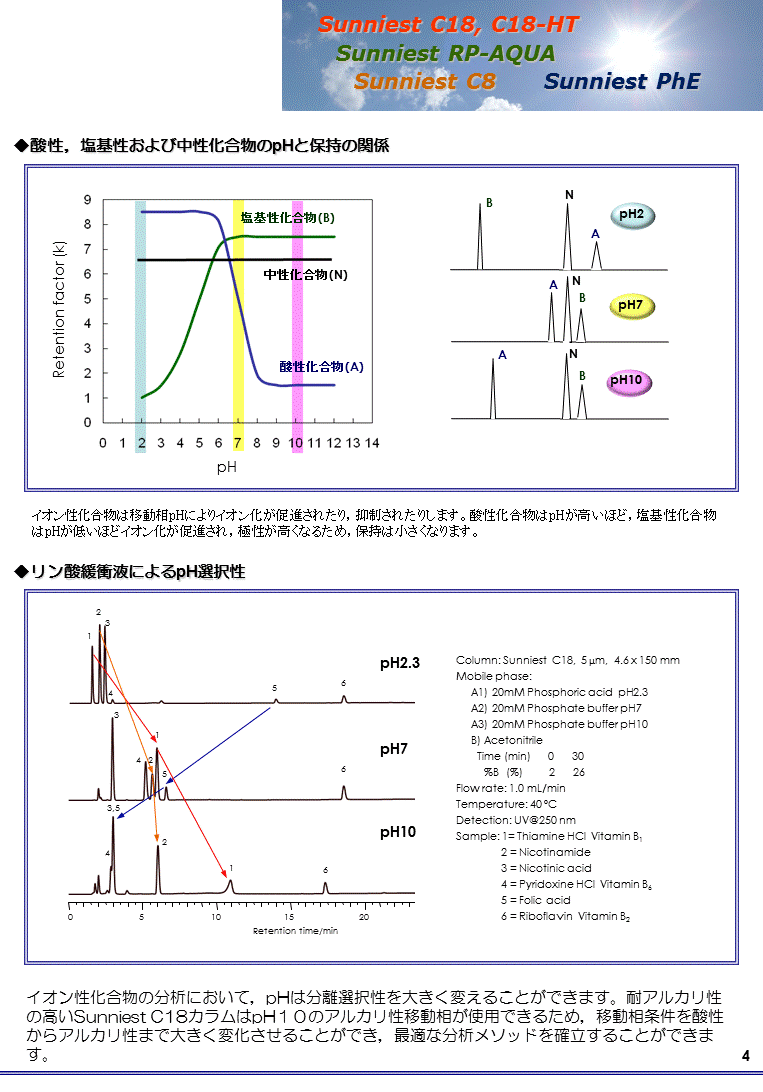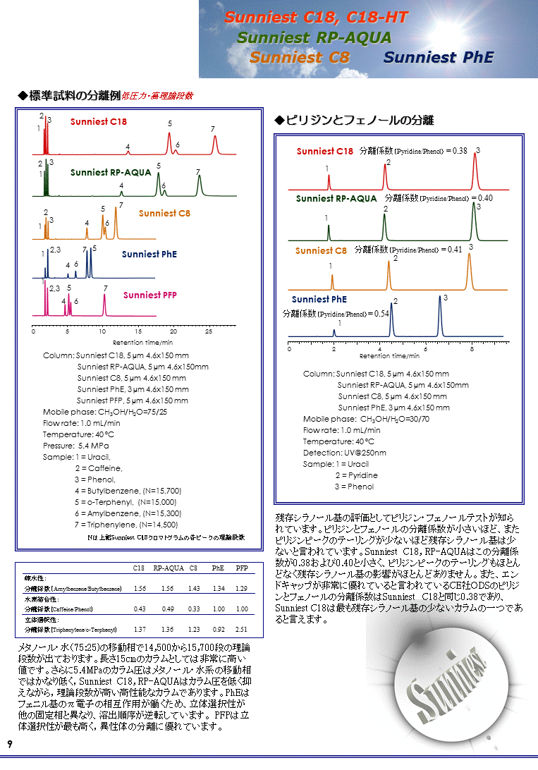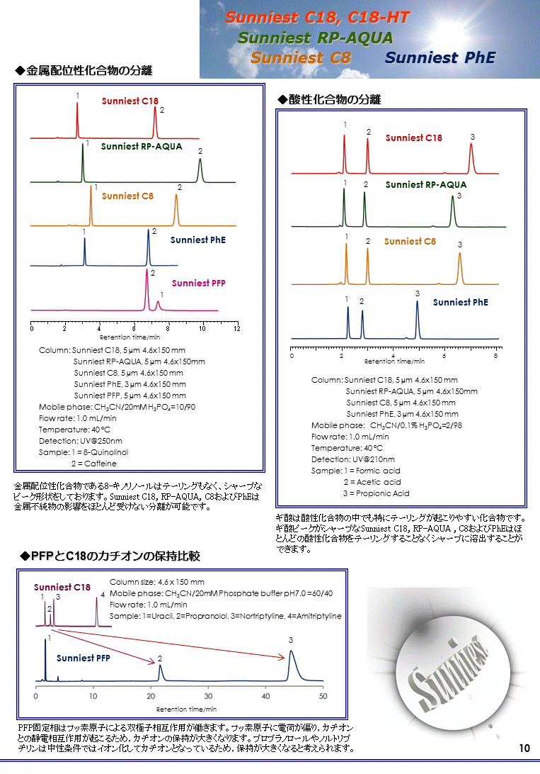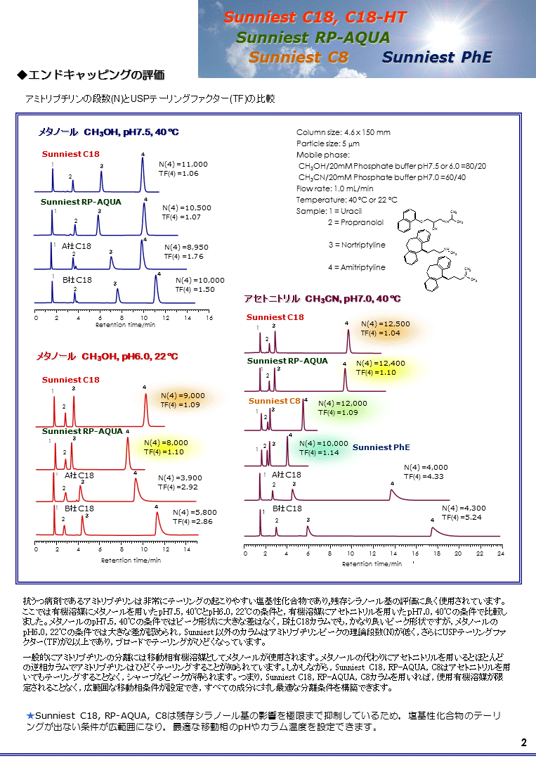 | SunniestはC18結合相を有する逆相カラムの中で最もシラノール基の影響が少なく、最も耐久性の高いカラムです。 |