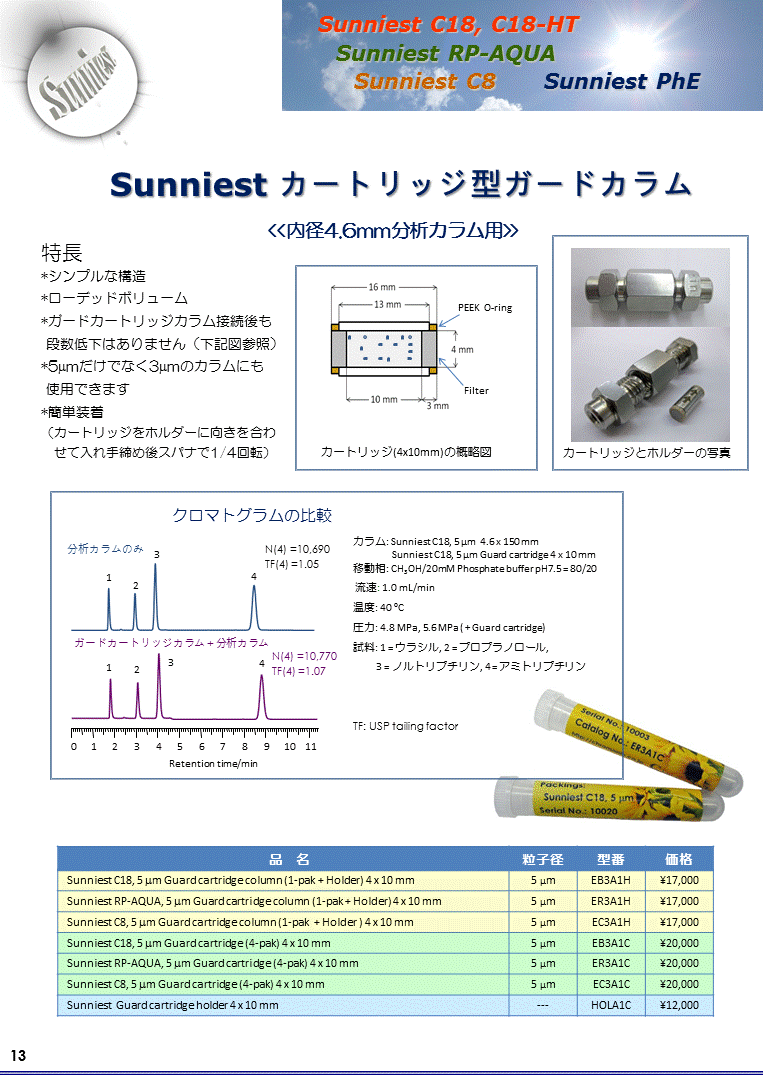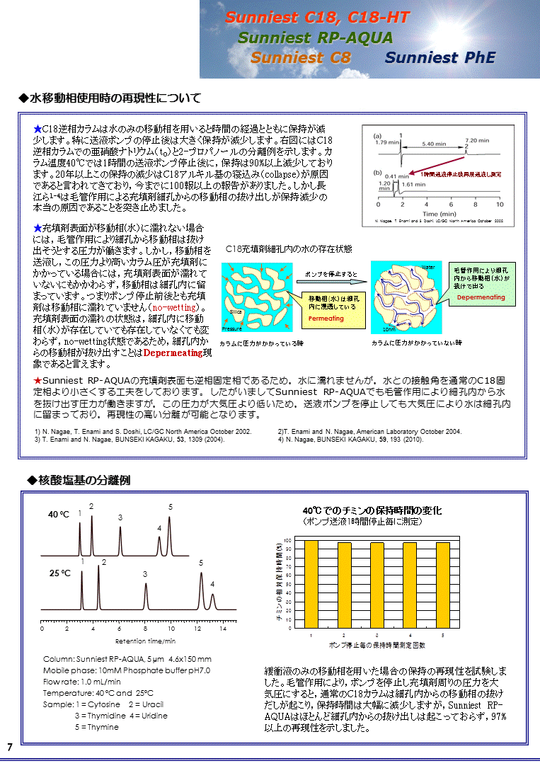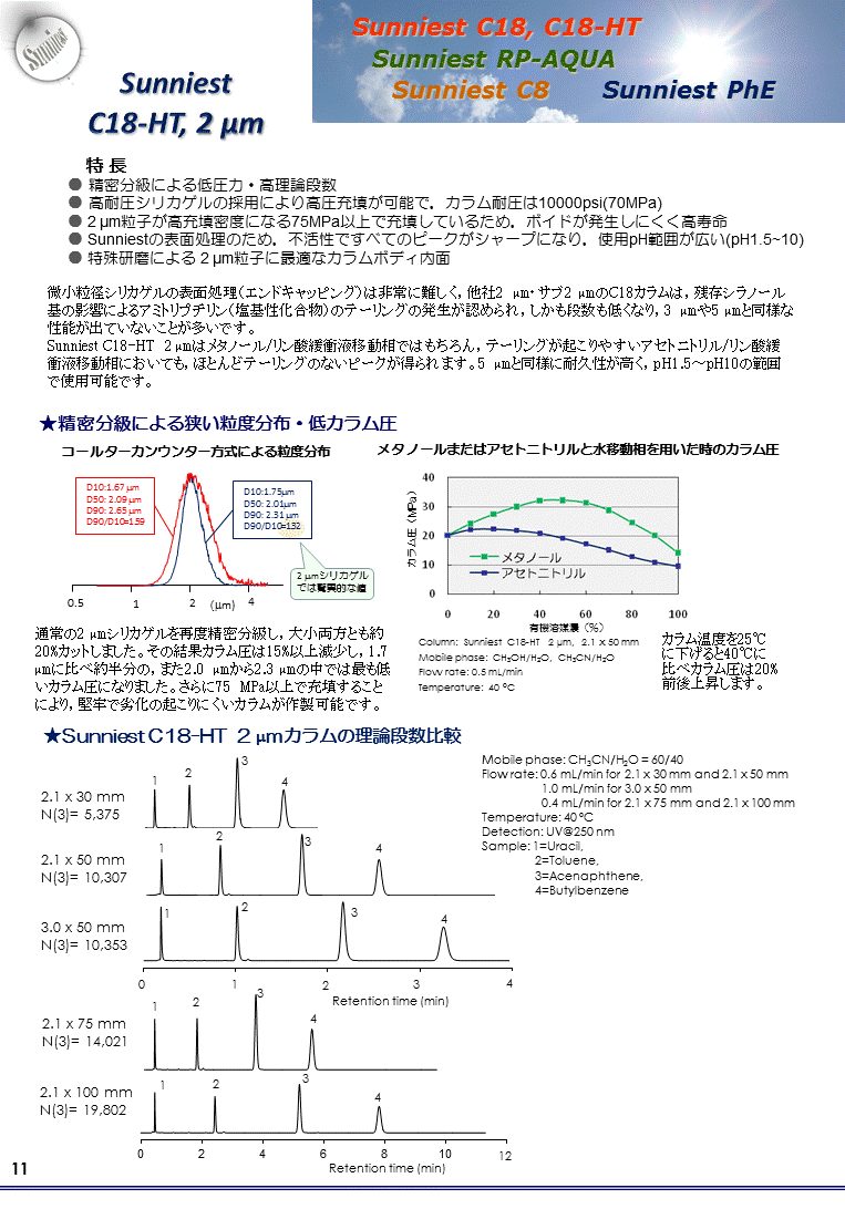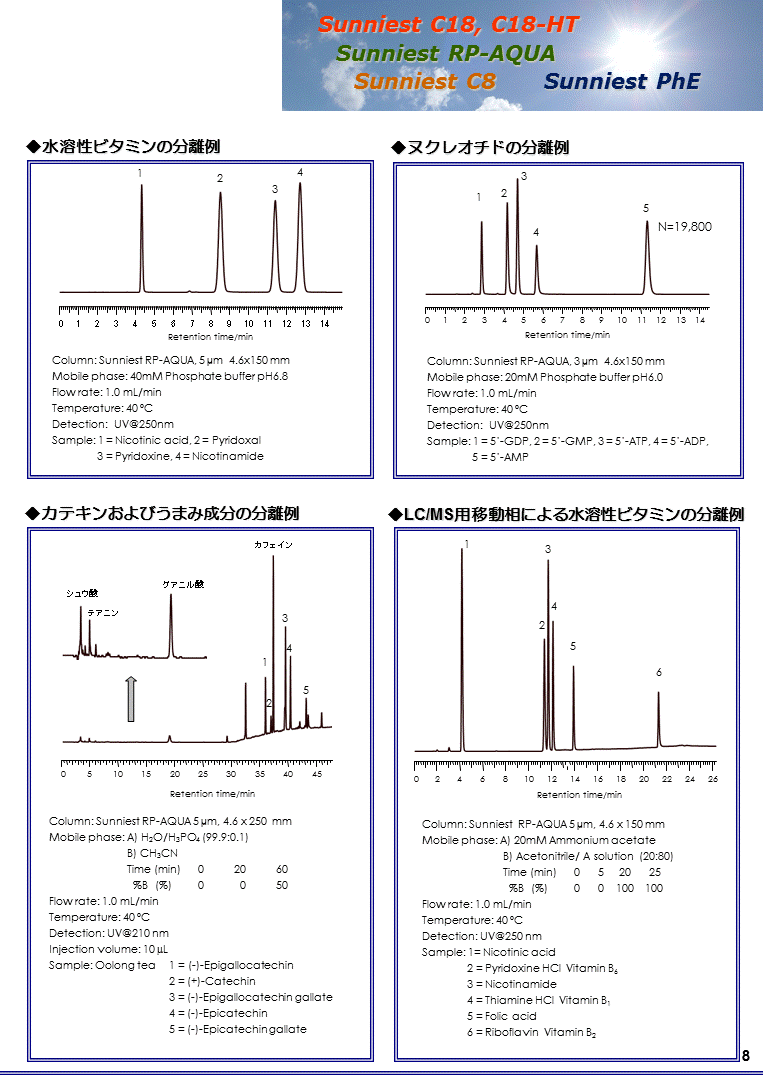 | SunniestはC18結合相を有する逆相カラムの中で最もシラノール基の影響が少なく、最も耐久性の高いカラムです。 |