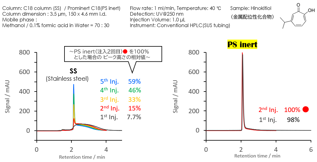 上記は、LC/MSを想定したギ酸移動相条件にて金属配位性化合物(ヒノキチオール)をPS inert、SSの両カラムで分析比較した事例です。SSでは初回注入時にピークが立たず、注入回数を重ねるごとにピーク強度が増していく傾向が見えます。一方のPS inertでは初回注入時から高いピーク強度が得られます。又、ピーク強度の良好な再現性を、ステンレス配管で構成された汎用HPLC環境で実現した事実にも注目下さい。カラムは比表面積が大きく、吸着サイトとしての影響が装置より遥かに大きい事を裏付けています。PS inertは既存装置のままイナート化を追求可能なメタルフリーカラムオプションです。