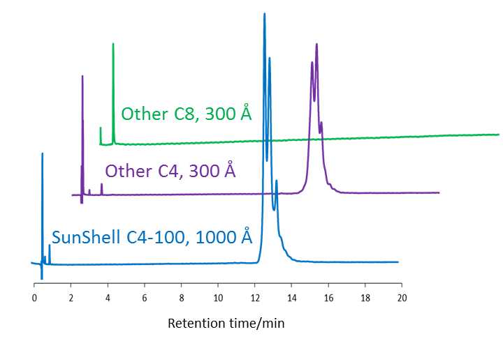 ピーク幅を比較すると、C4-30やC8-30よりも1000Åの細孔径を有するSunShell Bio C4(C4-100)の方がシャープなピークが得られております。